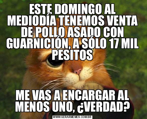 ESTE DOMINGO AL MEDIODÍA TENEMOS VENTA DE POLLO ASADO CON GUARNICIÓN, A SÓLO 17 MIL PESITOS ME VAS A ENCARGAR AL MENOS UNO, ¿VERDAD?